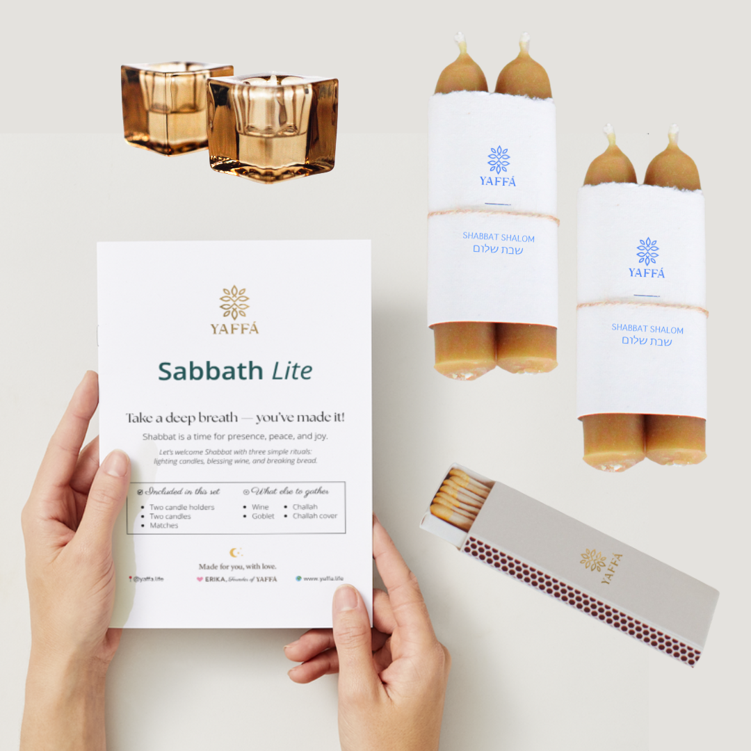 Light the candles, bless the wine, and share the bread. This introductory set includes two pairs of 100% beeswax candles, elegant glass holders, YAFFÁ matches, and the Sabbath Lite guide — with easy-to-follow blessings for each ritual.